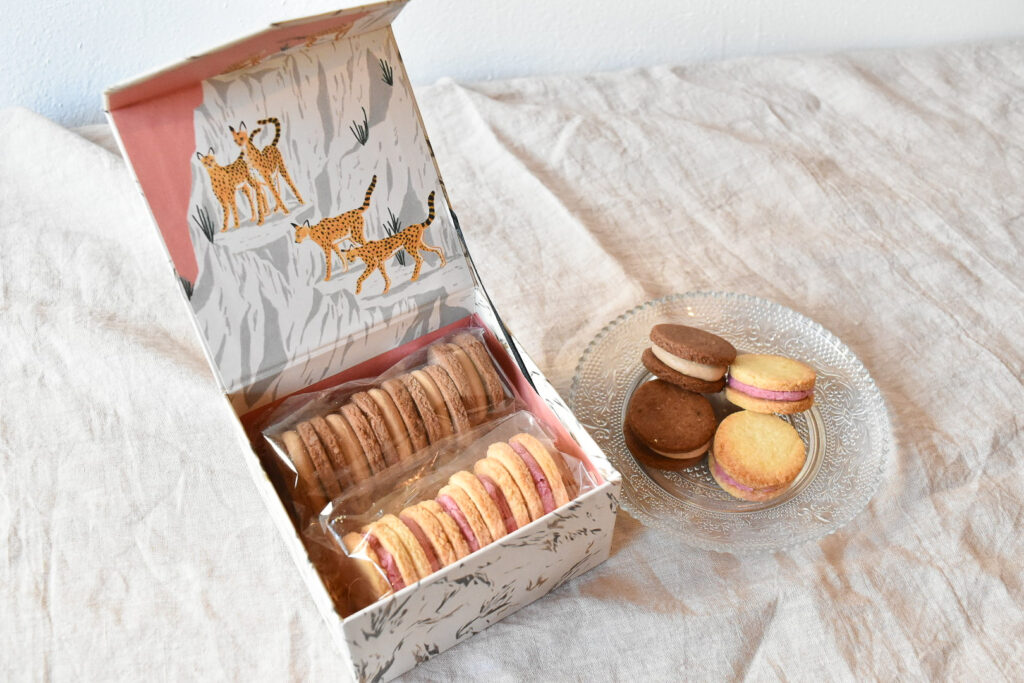 ヴィーガン&グルテンフリー、白砂糖不使用のチョコサンドクッキーです。 ラズベリークリームと、ヘーゼルナッツクリームがサンドされてます。 箱にはサーベルキャットがデザインされており、内側にもこだわりのイラストが!