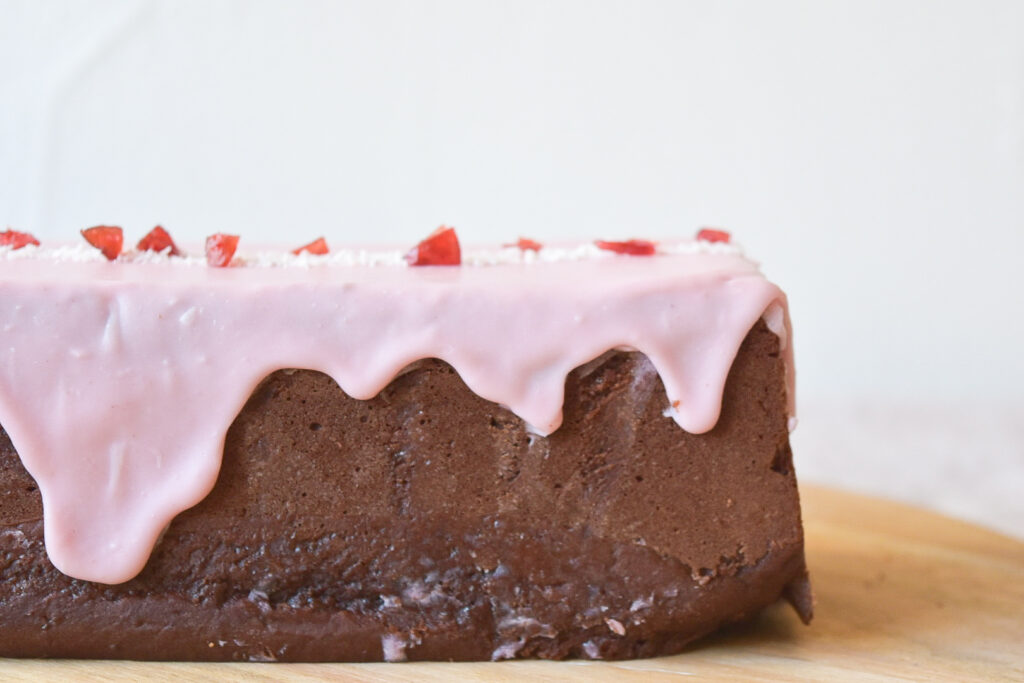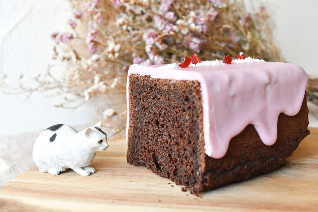 バレンタイン限定メニューのピンクのホワイトチョコレートがアイシングされたチョコレートケーキ。 ピンク色は、北海道産有機ビーツで色付けしました。 ビジュアルがキュートなので、プレゼントにもおすすめ。 ギフトボックスに入れてお届けします。お求めやすい価格のハーフサイズもご用意しました。