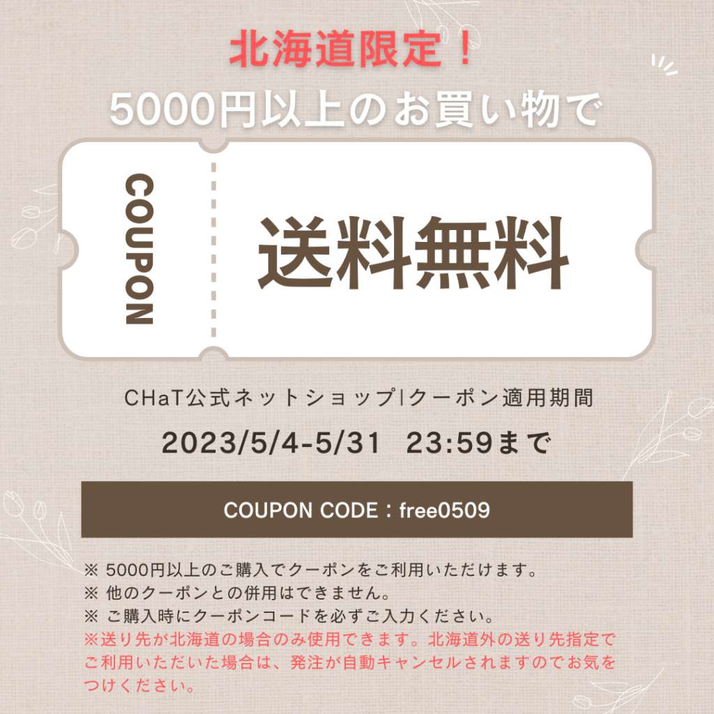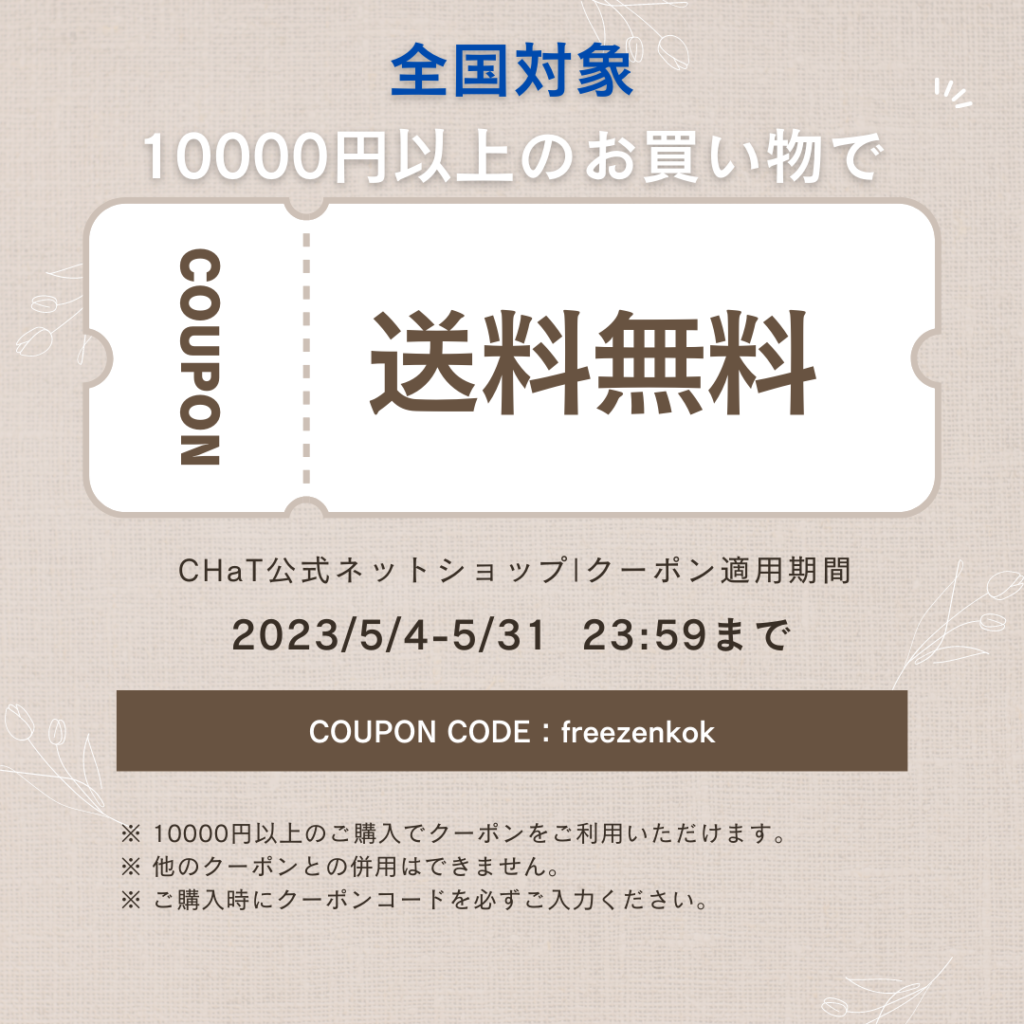 初めての企画。日頃のご利用を感謝して、CHaTのネットショップでご利用いただける送料無料クーポンを配布いたします。